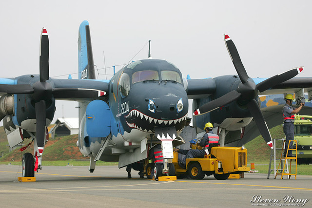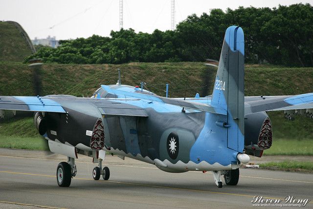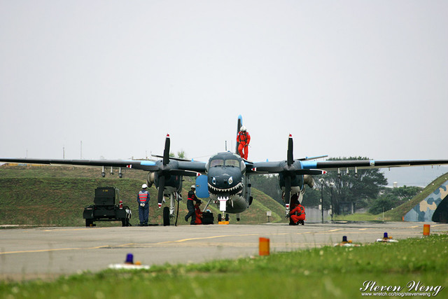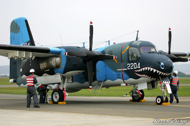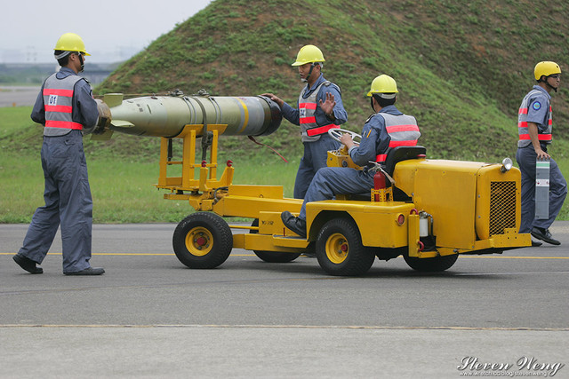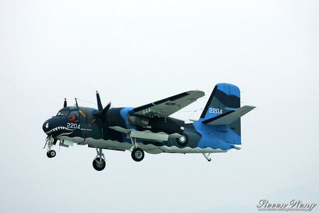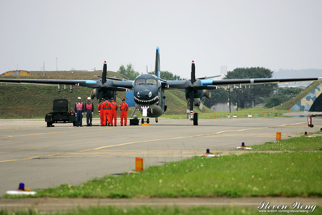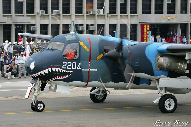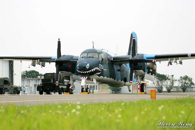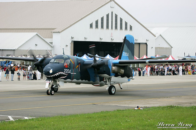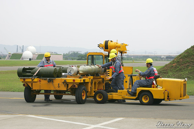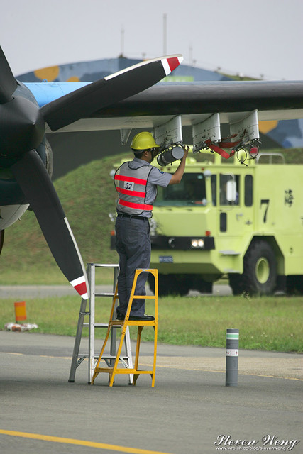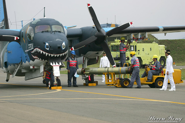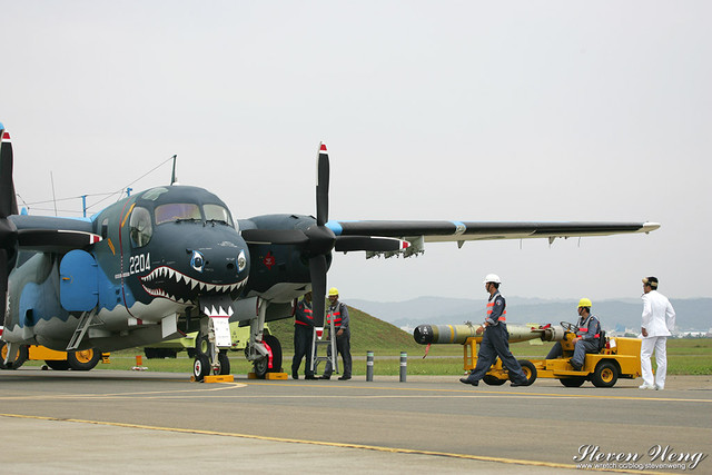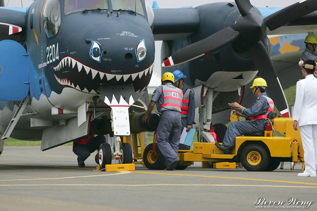 當天中午還在棚廠內納涼時,聽到幾位航迷通報,大坪展示的S-2T用拖車移動中,這代表著一定有些畫面可拍,果不其然,這架編號2204的S-2T在拖到定位後,開始實施裝掛。