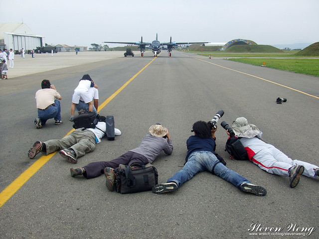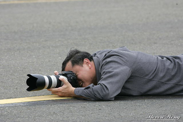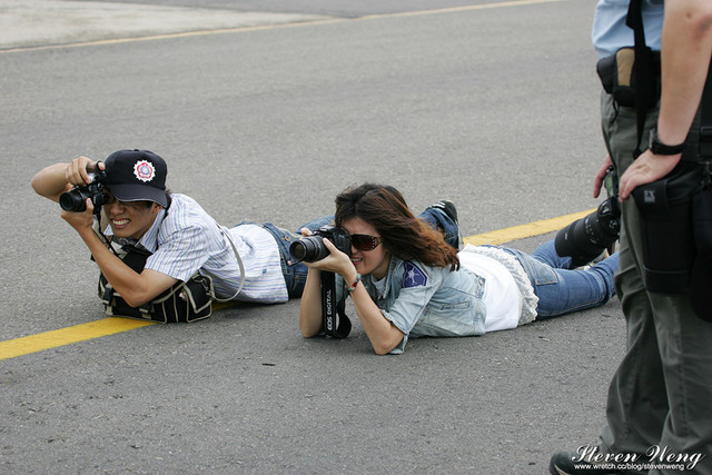 為了拍攝低角度的正面鯊魚照,不少航迷都一一趴在地上猛拍,連女生也不例外。